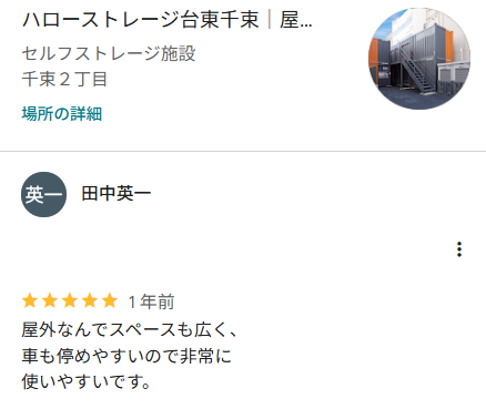 屋外なんでスペースも広く、 車も停めやすいので非常に 使いやすいです。