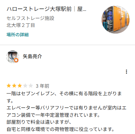 一階はセブンイレブン、その横に有る階段を上がります。 エレベーター等バリアフリーでは有りませんが室内はエアコン装備で一年中定温管理されています。 部屋割りで料金は違いますが、 自宅と同様な環境での荷物管理に役立っています。